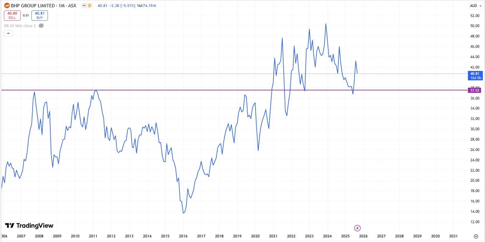 For context: BHP owns Olympic Dam, the largest uranium deposit in the world. Below is the price chart of BHP, basically trading at the same levels it was 20 years ago. Not exactly the rocket ship exposure you’d want if you’re betting on a uranium boom.