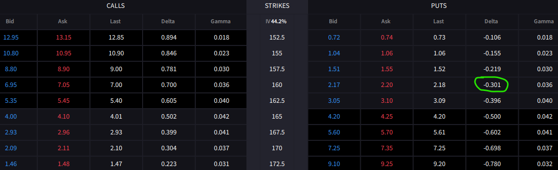 Note: For puts, delta is always shown as a negative number. In the AMD example above, you can see that the 30-delta put corresponds to the $160 strike contract.