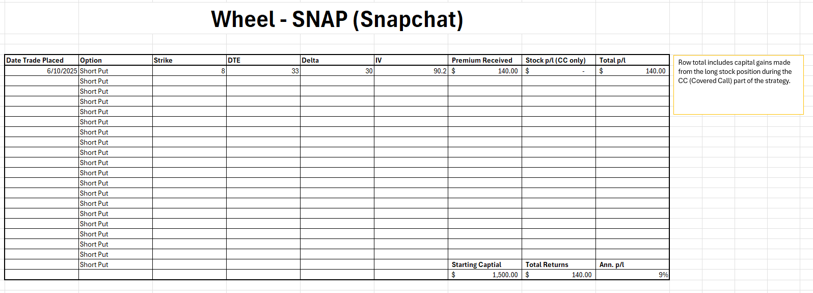 I’ve set it up using Snapchat as an example, but feel free to customize it for whatever stock you’re trading. If you’re wheeling multiple stocks, simply copy the sheet, create a new tab, and rename the tab and titles accordingly.